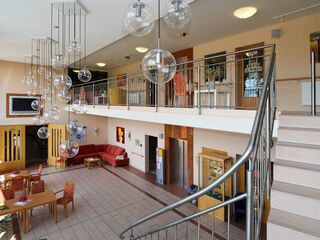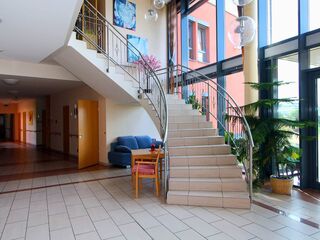 Die große, grüne Parkanlage, die das Haus umgibt, kann barrierefrei erreicht werden und lädt zum Spazieren und Verweilen ein – mit sonnigen Terrassenflächen und vielen weiteren Möglichkeiten zum Niederlassen. Die ruhige und fast autofreie Umgebung bietet ideale Möglichkeiten, vom Alltag abzuschalten und die Natur zu erleben.